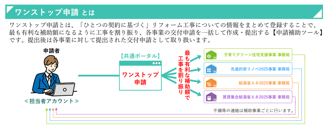 住宅省エネ2025キャンペーンでは、「ワンストップ申請」が可能です。これはひとつの契約に基づくリフォーム工事情報をまとめて登録することで、各事業の中でもっとも有利な補助額になるように割り振り申請できる仕組みです。