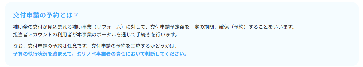 先進的窓リノベ2025事業では、補助金の交付が見込まれる補助事業(リフォーム)に対して、交付申請予定額を一定の期間、確保(予約)できます。実際の手続きは、担当者アカウントの利用者が本事業のポータルを通じて実施する仕組みです。