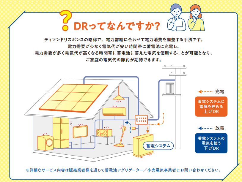 そもそも「DR」とは「ディマンドリスポンス」の略称で、電力需給に合わせて電力消費を調整する手法です。具体的には蓄電池を用いることで電力需要が少なく電気代が安い時間帯に充電し、電気代が高くなる時間帯に使用します。これにより、家庭での電気代節約が期待できます。