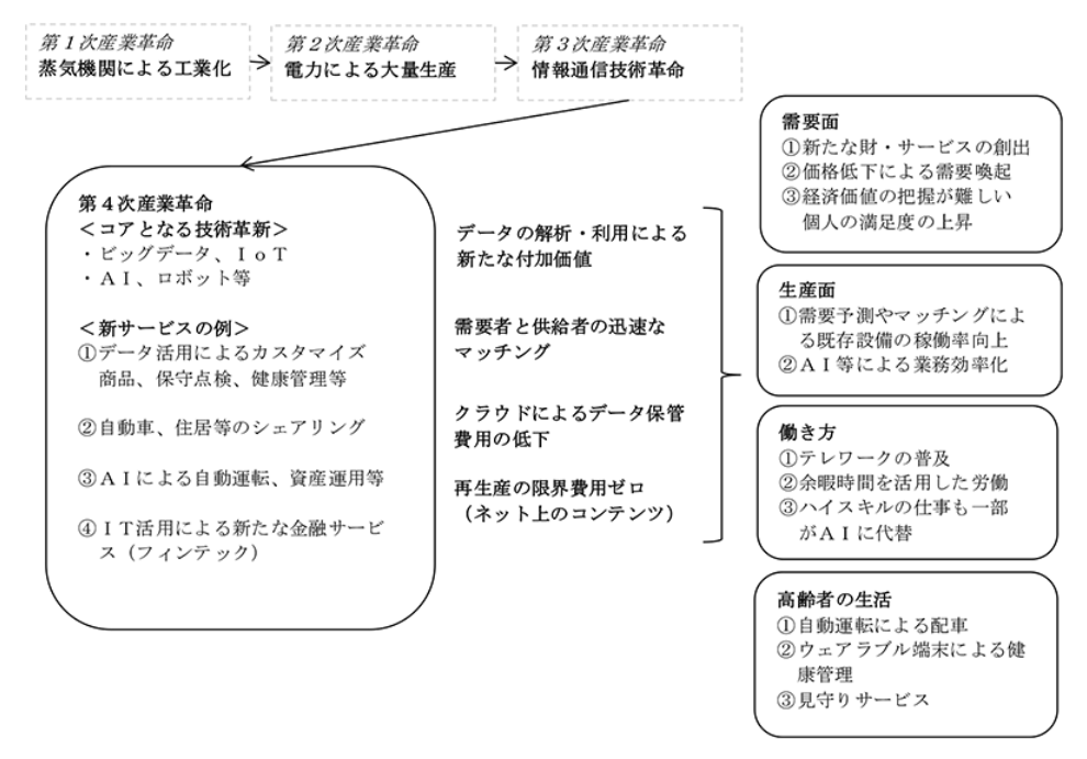「第4次産業革命とは、18世紀末以降の水力や蒸気機関による工場の機械化である第1次産業革命、20世紀初頭の分業に基づく電力を用いた大量生産である第2次産業革命、1970年代初頭からの電子工学や情報技術を用いた一層のオートメーション化である第3次産業革命に続く(中略)いくつかのコアとなる技術革新を指す」