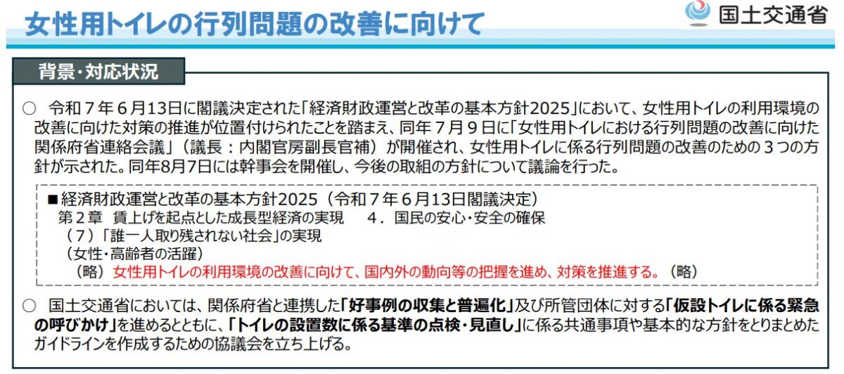 2025年6月13日に閣議決定された「経済財政運営と改革の基本方針2025」において、女性用トイレの利用環境の改善に向けた対策の推進が位置付けられました。