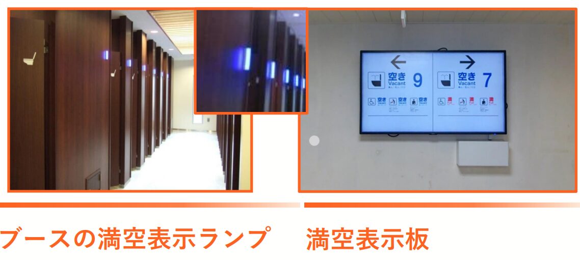 またスタジアムやサービスエリア等の大規模トイレでは、トイレブースの分岐部に空室状況がわかるモニターを設置する方法もあります。