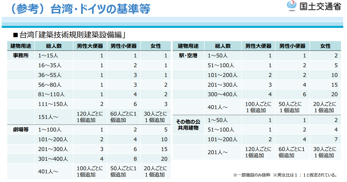 台湾では、「建築技術規則建築設備編」においてトイレの設置基準が定められています。