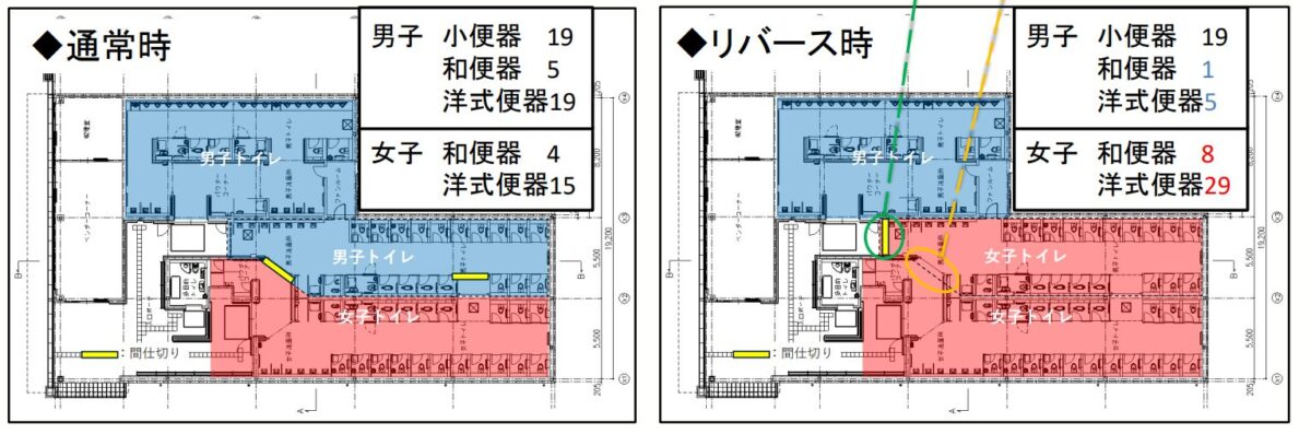 しかしトイレの設計が従来の利用想定のまま更新されていない場合、利用者数の増加に対応できず、女性用トイレに行列が集中する要因となります。