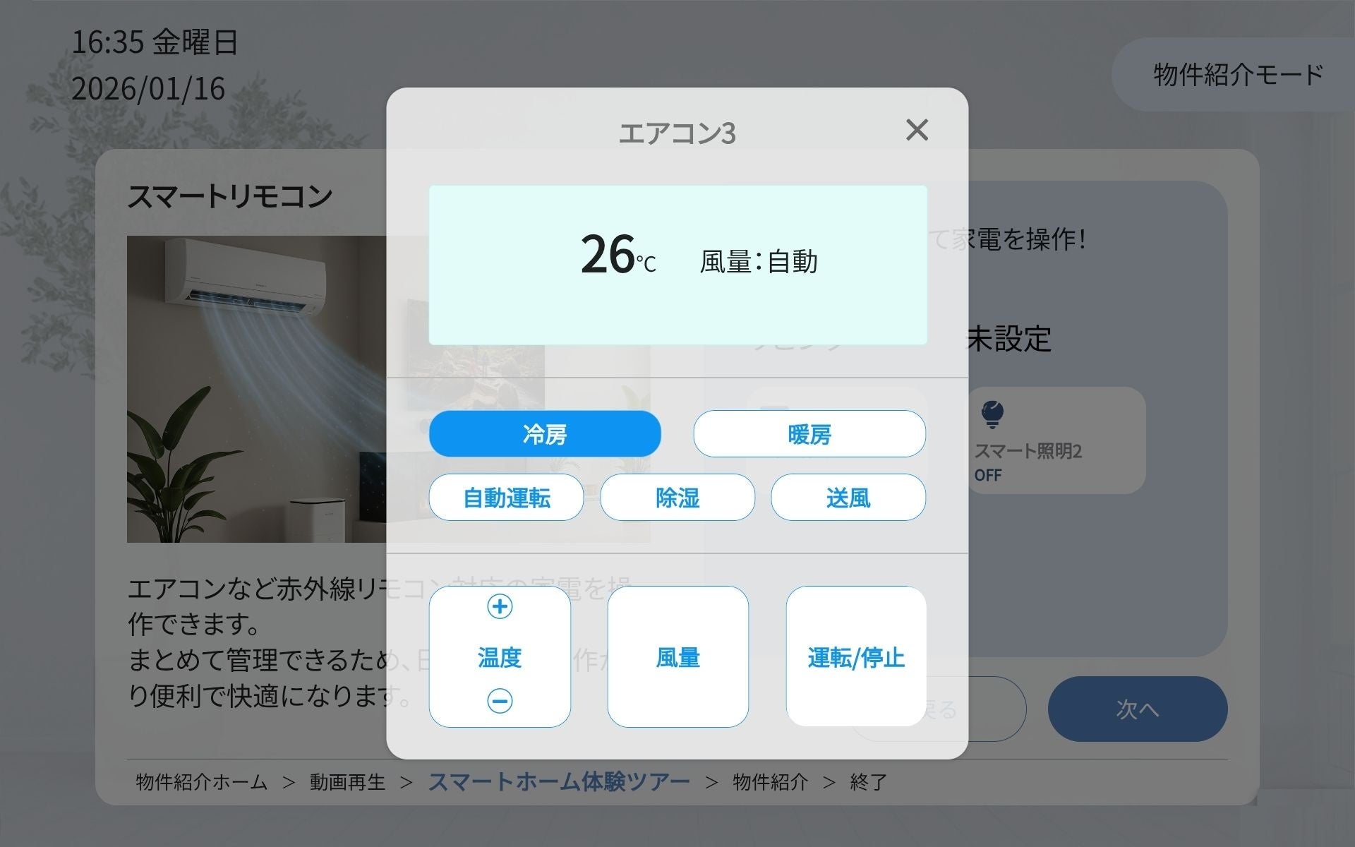 室内に設置されたスマートロックや家電、セキュリティ機能などのIoT機器を体験できる操作画面を表示します。内見者は画面をタップするだけで実際の機器を操作でき、言葉では伝わりにくい「スマートホームのある便利な暮らし」を直感的に体感できます。