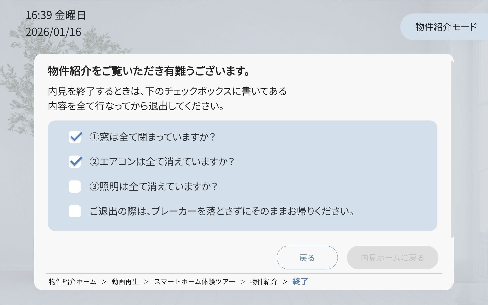 内見終了時の退出前には、「窓の施錠確認」「エアコン・照明の消灯」などのチェック項目を画面に表示します。人為的なミスによる雨水浸入等の物件被害や、無駄な電気代の発生を抑制し、安全な空室運用を実現します。