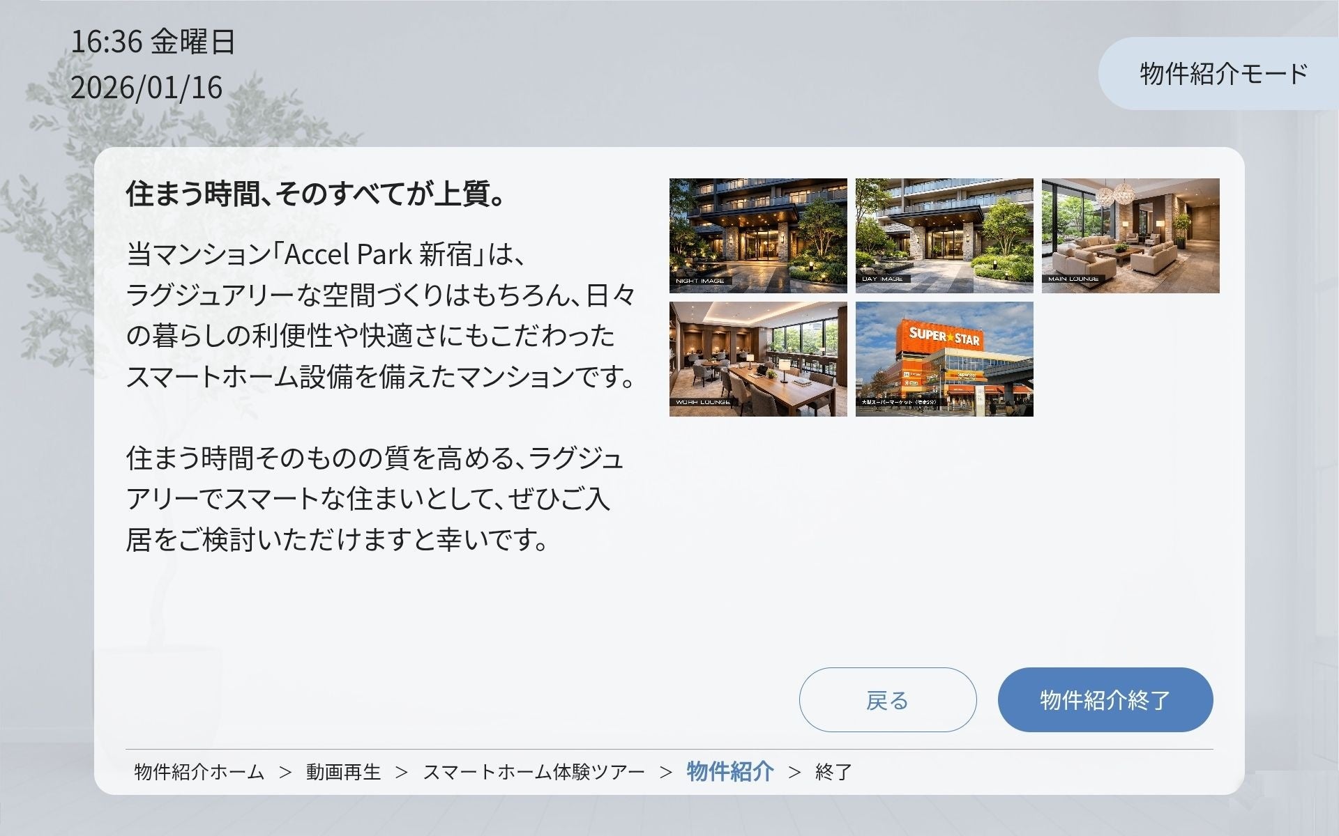 物件に入室した瞬間、住宅ブランドや物件のキービジュアルをトップ画面に表示します。ブランド名やマンション名などを自由に設定でき、内見者に第一印象で物件コンセプトを強く印象付けます。
