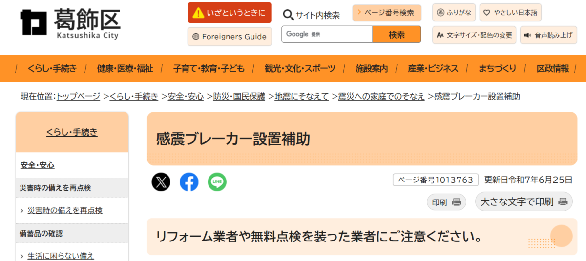 ここでは、感震ブレーカーに対する補助金について解説します。ご紹介している自治体以外にも独自制度を実施している場合があるため、ぜひ各自治体の公式サイトをご確認ください。