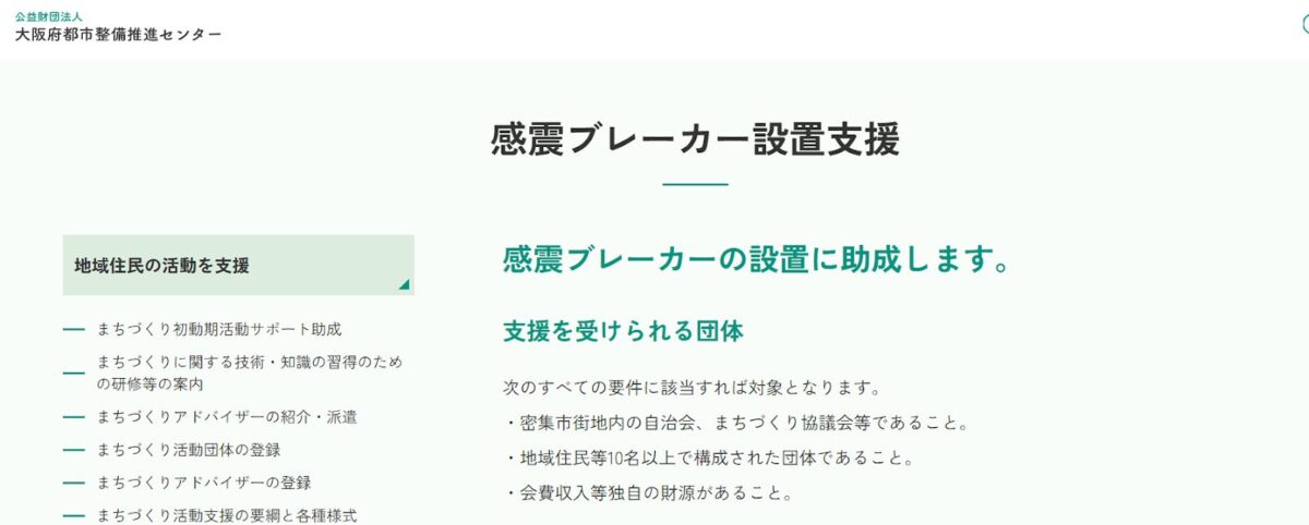 大阪府内では、㈶大阪府都市整備推進センターを通じて、住宅密集地の自治会やまちづくり協議会などが実施する感震ブレーカーの設置活動に対して助成が実施されています。
