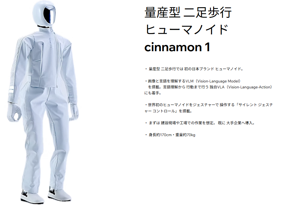 日本のドーナッツロボティクス社が開発した「cinnamon 1」は量産型の人型ロボットで、建設現場での活用を見据えた設計が特徴です。身長約170cmの本体に複数のカメラやLiDARを搭載し、周囲の状況を正確に把握しながら自律行動が可能です。