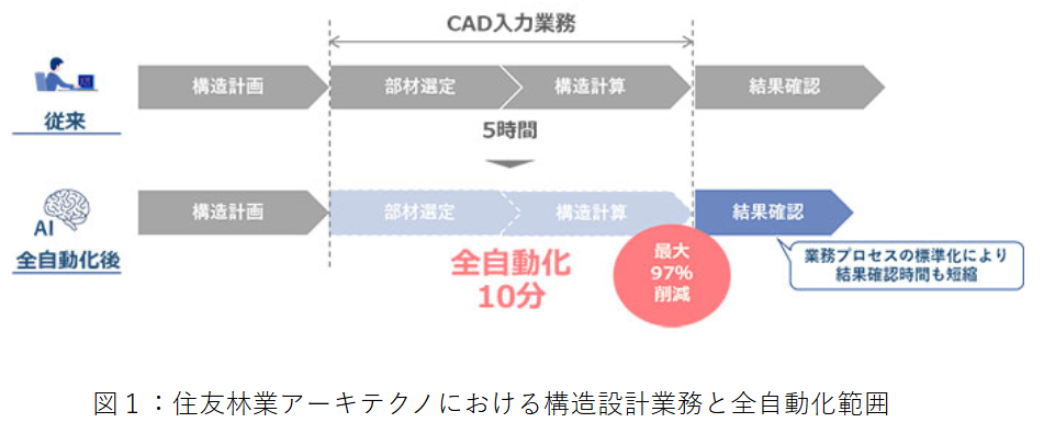 従来、構造設計者が約5時間かかっていた作業を10分程度に短縮し、業務プロセスの標準化や施工精度向上、コスト削減につなげています。