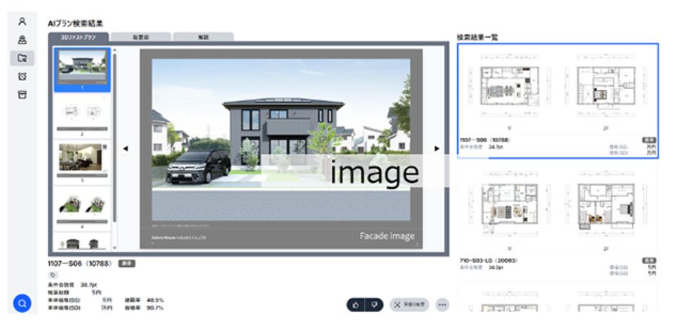 大和ハウス工業は、AIを活用した住宅プラン提案サービス「AIプランコンシェルジュ」を開発・運用しています。顧客の敷地条件や要望、予算を入力すると、同社の2,000以上のプランからAIが要望への合致度をスコア化し、最適プランを数秒で複数提案する仕組みです。