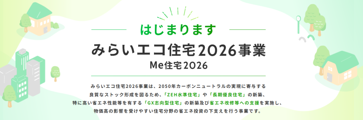みらいエコ住宅2026事業(Me住宅2026)とは、国土交通省と環境省による住宅関連補助金事業です。2025年度の「子育てグリーン住宅支援事業」の後継事業で、2026年度より実施されます。