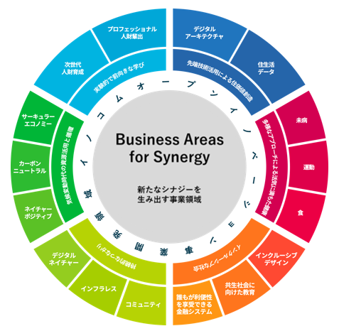 積水ハウスグループでは、2024 年 2 月に「積水ハウス イノベーション&コミュニケーション株式会社」を設立しました。イノベーション人財やグローバル人財の育成に加え、社外パートナーとのオープンイノベーションを通じて、社会に新たな価値を創造し、人々の生活をより豊かに、より幸せにすることを目指しています。事業創出においては、”Business Areas for Synergy(新たなシナジーを生み出す事業領域)”のコンセプトに基づきオープンイノベーションを推進することで、協業先とお互いの事業成長や人財価値の向上に寄与しながら、「住まいと暮らし」に関する様々な社会課題解決を目指します。