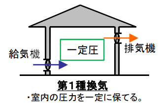 第一種換気は、給気と排気の両方を機械で制御する換気方式です。外気の取り込み量と排出量をバランスよく調整できるため安定した換気が可能で、室内の気圧差も生じにくいといった特徴があります。