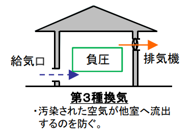 第二種換気は、機械で給気して排気を自然に任せる方式です。室内の空気圧が外部より高くなる「正圧」状態をつくるため、外気の侵入を抑えたいクリーンルームや医療施設などで採用されることがあります。