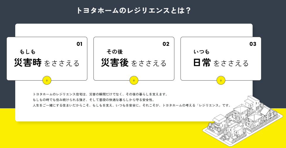 セキスイハイムでは、日常・災害時・災害後の3つの視点から住まいのレジリエンスを高める住宅づくりを提案しています。高い耐震性能を持つ構造に加え、太陽光発電や蓄電池などを組み合わせたエネルギー自給型の住まいを目指している点が特徴です。