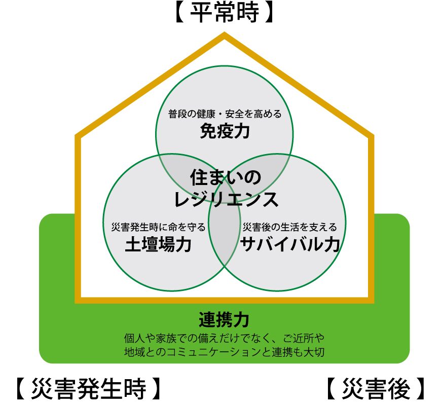 災害時に建物が倒壊・損壊するリスクを低減し、家族が安全に避難できる環境を整えることがレジリエンス住宅の大きな目的とされています。