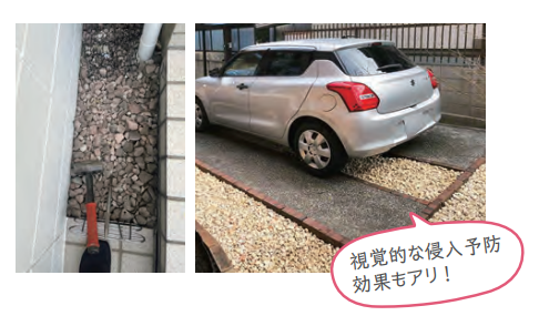 踏むと音が出る防犯砂利を敷くことで、不審者の接近に気づきやすくなります。侵入者は音が発生して気付かれることを嫌がるため、心理的な抑止効果も期待できます。比較的低コストで取り入れやすい防犯対策です。