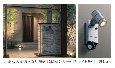 人の動きを感知して点灯するセンサーライトは、不審者を驚かせると同時に周囲に存在を知らせる効果があります。夜間の侵入を防ぐ対策として有効で、玄関や勝手口、庭などに設置するのがおすすめです。電気代も抑えやすく、手軽に導入しやすい点もメリットです。