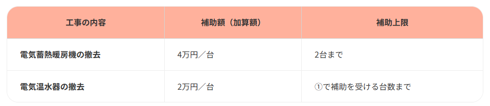 ①の給湯器の設置に合わせて、上記いずれかの撤去工事を行う場合、その工事に応じた定額が補助されます。