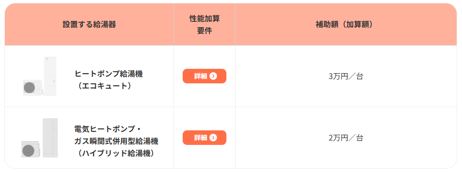 ①の給湯器について、それぞれの性能加算要件を満たす場合、その性能に応じた定額が補助されます。