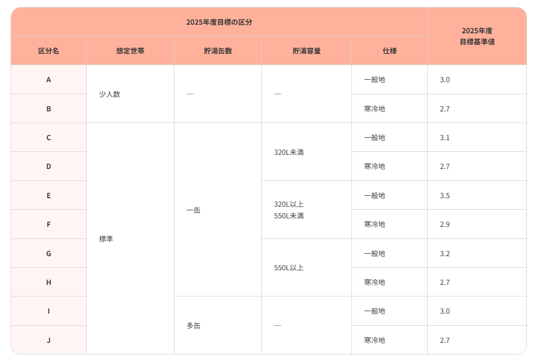 - 基本の性能要件の機種と比べて、5%以上CO2排出量が少ないものとして、2025年度の目標基準値(JIS C 9220 年間給湯保温効率又は年間給湯効率(寒冷地含む))+0.2以上の性能値を有するもの。