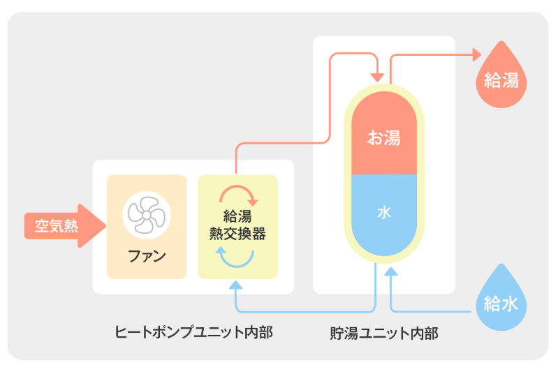 エコキュートは、ヒートポンプの原理を利用する給湯器です。夜間電力や太陽光で発電した電力を有効に利用して冷媒の圧縮・膨張サイクルによりお湯を作ることで、必要な時に貯湯タンクのお湯が使えます。