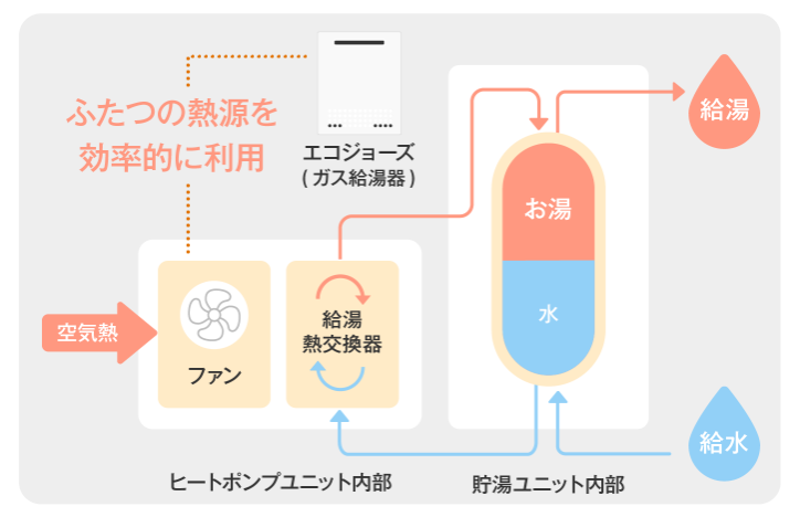 ハイブリッド給湯機は、ヒートポンプ給湯機とガス温水機器を組み合わせたシステムです。ふたつの熱源を効率的に⽤いることで、⾼効率な給湯が可能になります。