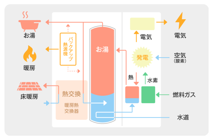 エネファームは、都市ガスやLPガス等から水素を作り、その水素と空気中の酸素の化学反応により発電するシステムです。エネルギーを燃やさずに直接利⽤するので⾼い発電効率が得られます。また発電の際に発生する排熱を回収することで、給湯器としての役割も果たします。