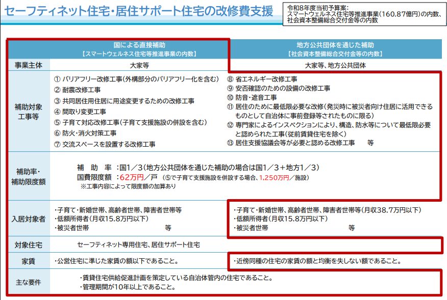 「セーフティネット住宅改修事業」は、高齢者、障害者、低所得者、子育て世帯など住宅確保要配慮者の入居を受け入れる賃貸住宅について、バリアフリー化や居住性能向上のための改修費を補助する事業です。