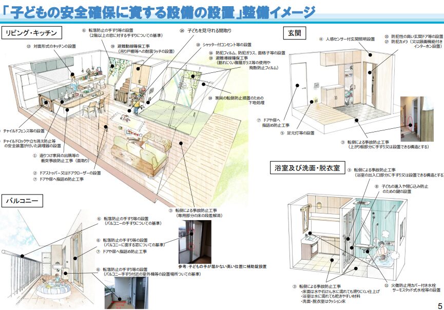 子育て世帯が安心して暮らせる集合住宅の普及促進を目的とした制度です。補助対象は「子どもの安全・安心、親が快適に暮らせる環境の確保に資する設備の設置」で、子どもの安全確保に関する工事の補助金額は下記の通りです。