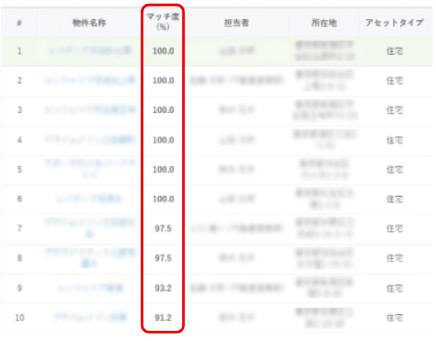 - 購入ニーズの条件に100%マッチする物件のみならず、条件から若干外れていてもヒトの感覚では紹介できそうな物件(例:購入ニーズ条件の価格が20億円以上でも19億円の物件であれば紹介候補となりうる)を含めたリストの自動抽出が可能に